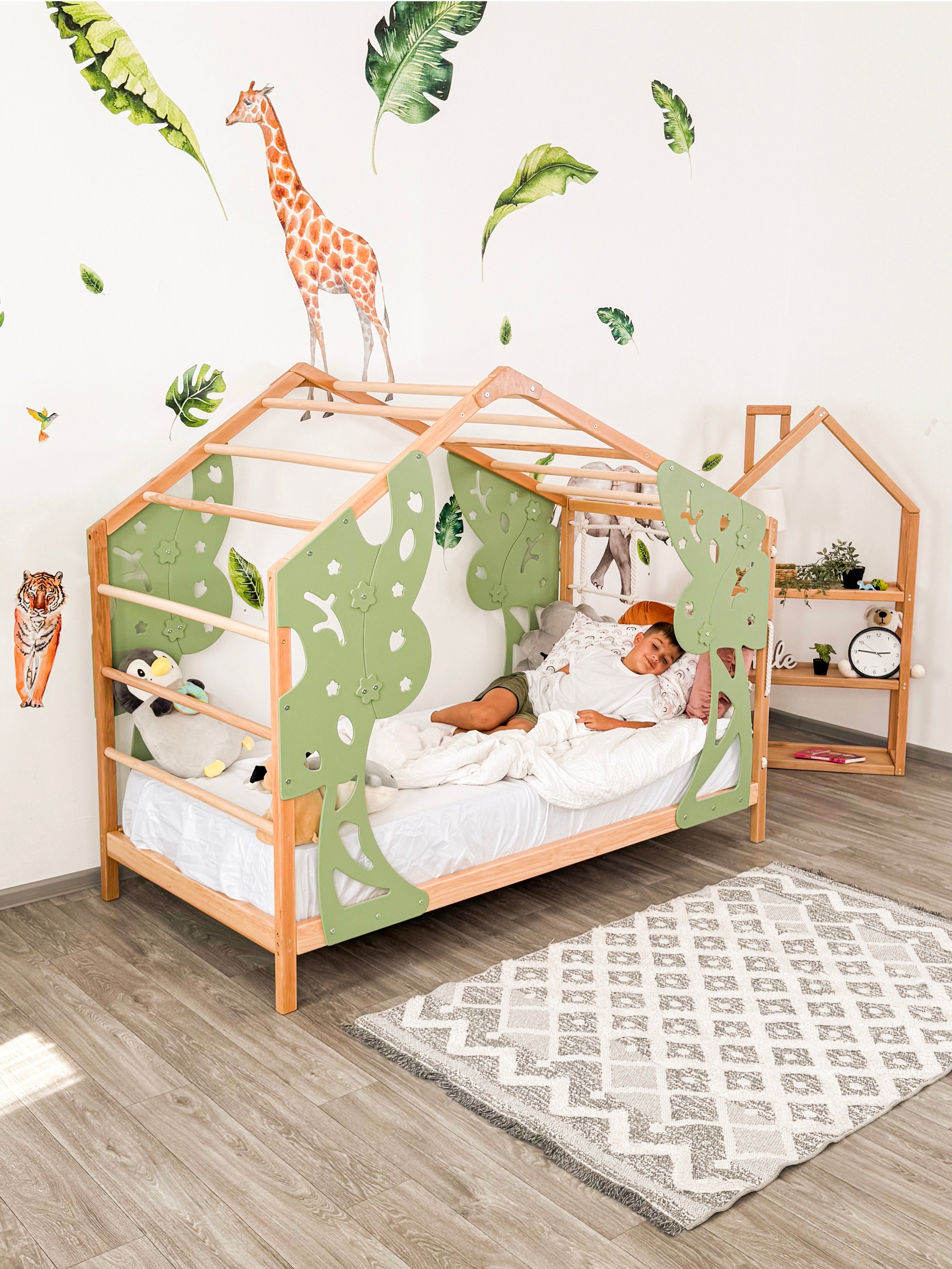 ⭐️ BusyWood Forest Bed is a unique combination of a comfortable toddler bed and a wooden play gym. This kids playground is created to give your child personal space, relaxing rest and active development at the same time. This extraordinary bed features a rope net wall and a sturdy ladder, transforming bedtime into a thrilling escapade. Designed to serve as both a cozy toddler bed for peaceful slumber and an exhilarating playhouse for endless fun and frolic, it guarantees hours of joyous activities for your kiddo.