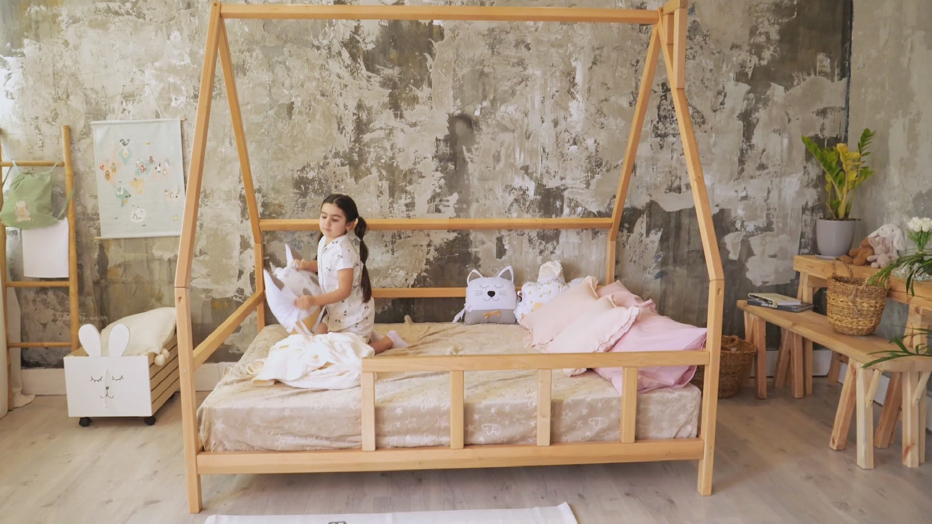 ✦ The kids' Montessori Bed is an integral and super fun part of the Montessori Bedroom. This bed enables freedom of movement, independence, and mobility of the child. Children can explore the environment, wake up and move around without the possibility of falling off the bed.