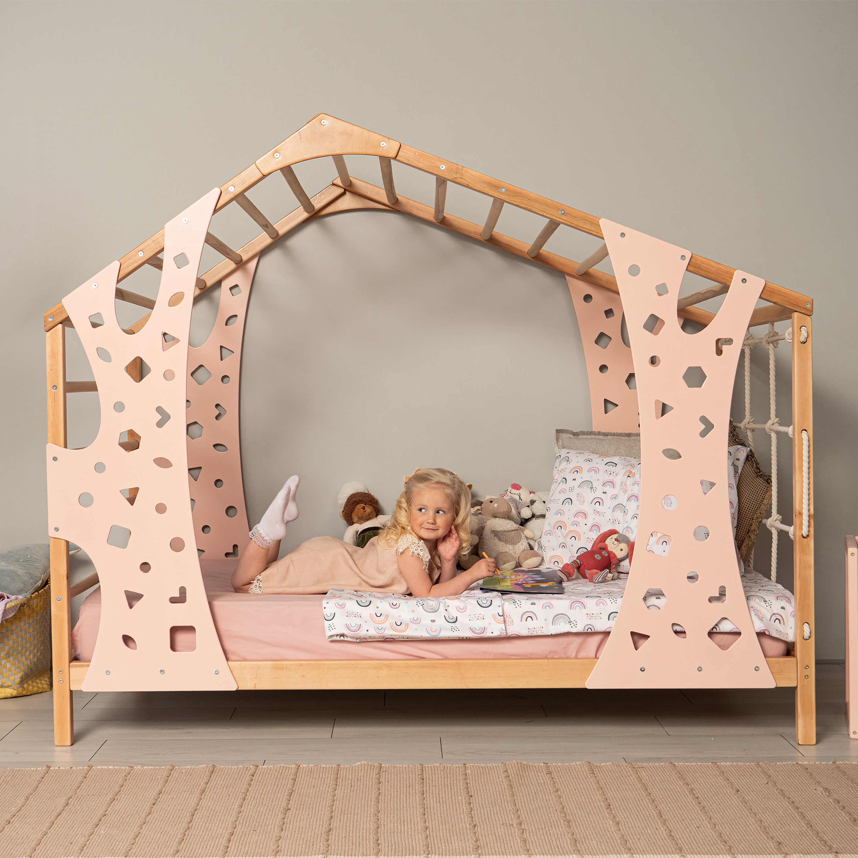 ⭐️ BusyWood Monkey Bed is a unique combination of a comfortable toddler bed and a wooden play gym. This kids playground is created to give your child personal space, relaxing rest and active development at the same time. This extraordinary bed features a rope net wall and a sturdy ladder, transforming bedtime into a thrilling escapade. Designed to serve as both a cozy floor bed for peaceful slumber and an exhilarating playhouse for endless fun and frolic, it guarantees hours of joyous activities for your kiddo.