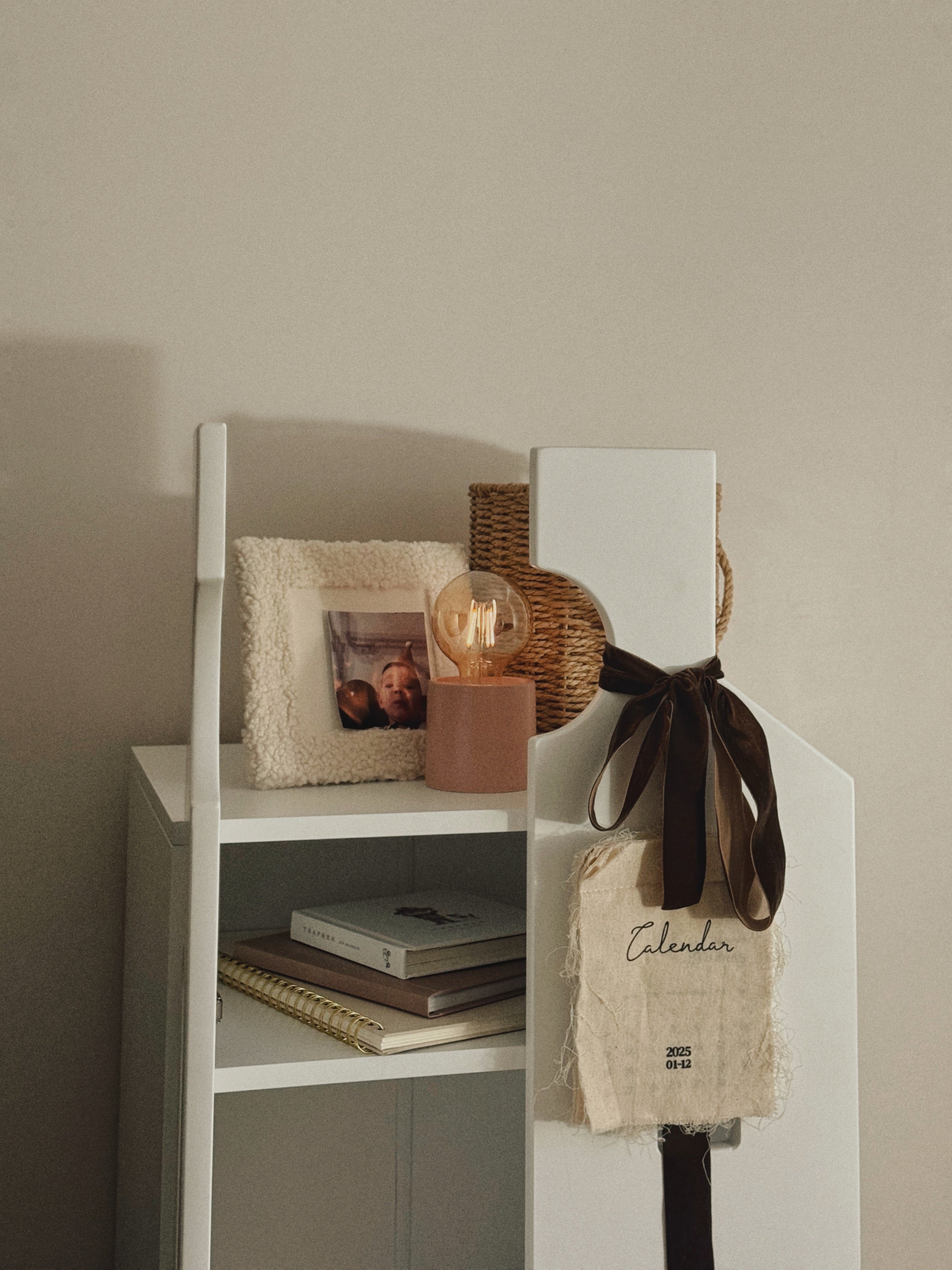 The color of the frame and storage units is White.