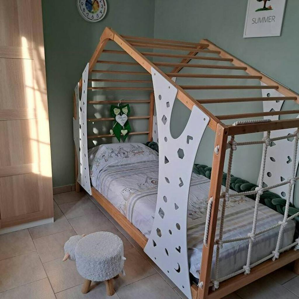 BusyWood Monkey Bed is a unique combination of a comfortable toddler bed and a wooden play gym. This kids playground is created to give your child personal space, relaxing rest and active development at the same time. This extraordinary bed features a rope net wall and a sturdy ladder, transforming bedtime into a thrilling escapade. Designed to serve as both a cozy floor bed for peaceful slumber and an exhilarating playhouse for endless fun and frolic, it guarantees hours of joyous activities for your kiddo.