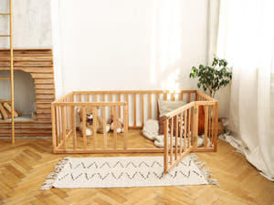 Choosing a floor bed with rails helps protect your child from sudden falls while also encouraging independence. With this kind of bed, you can leave your child alone for short periods, which they will gradually get used to. This promotes their abilities and fosters the Montessori principle of self-sufficiency. Additionally, our floor beds are made from natural wood, and the paints and varnishes we use are water-based, ensuring a safe and eco-friendly environment for your child.