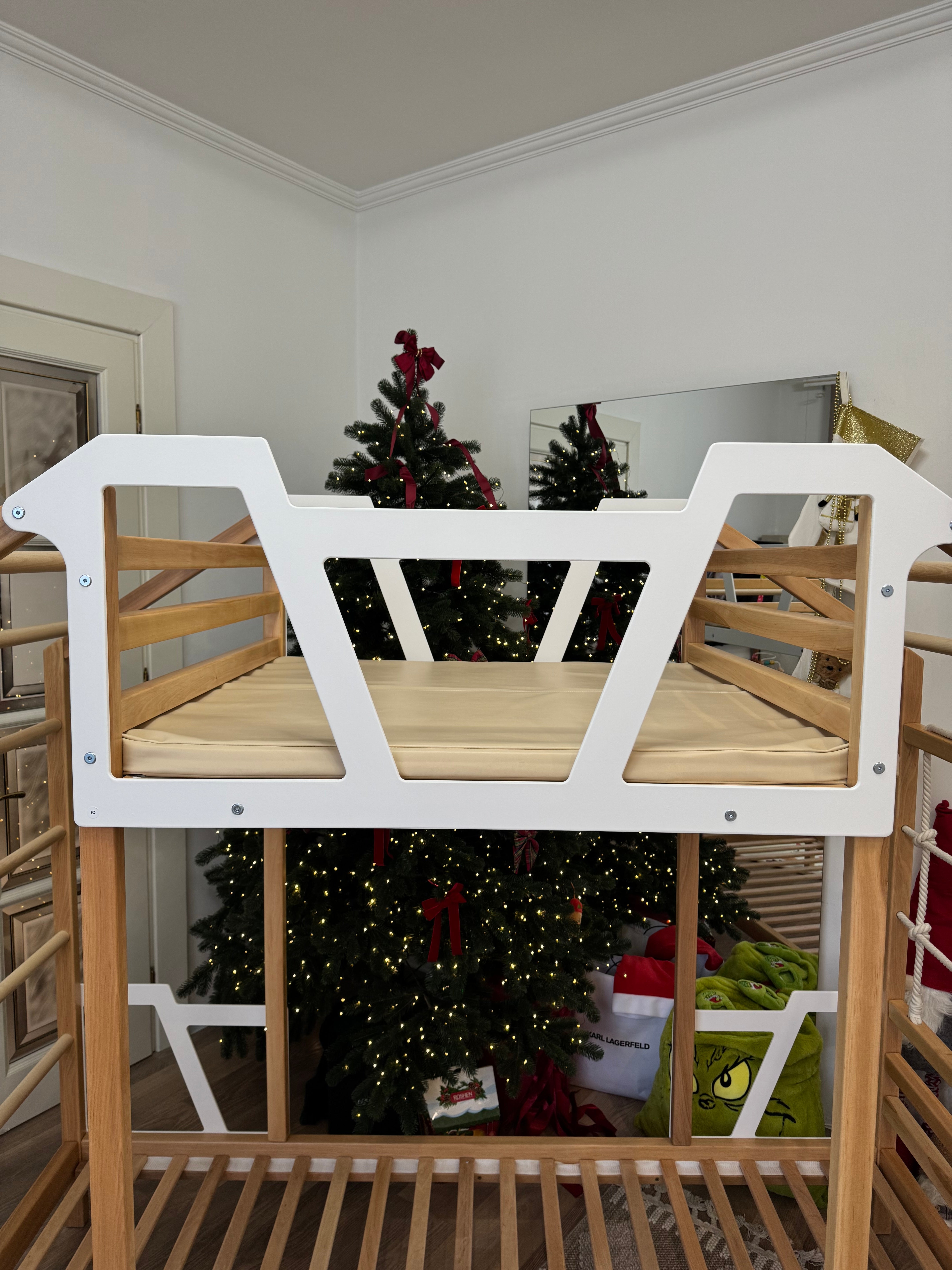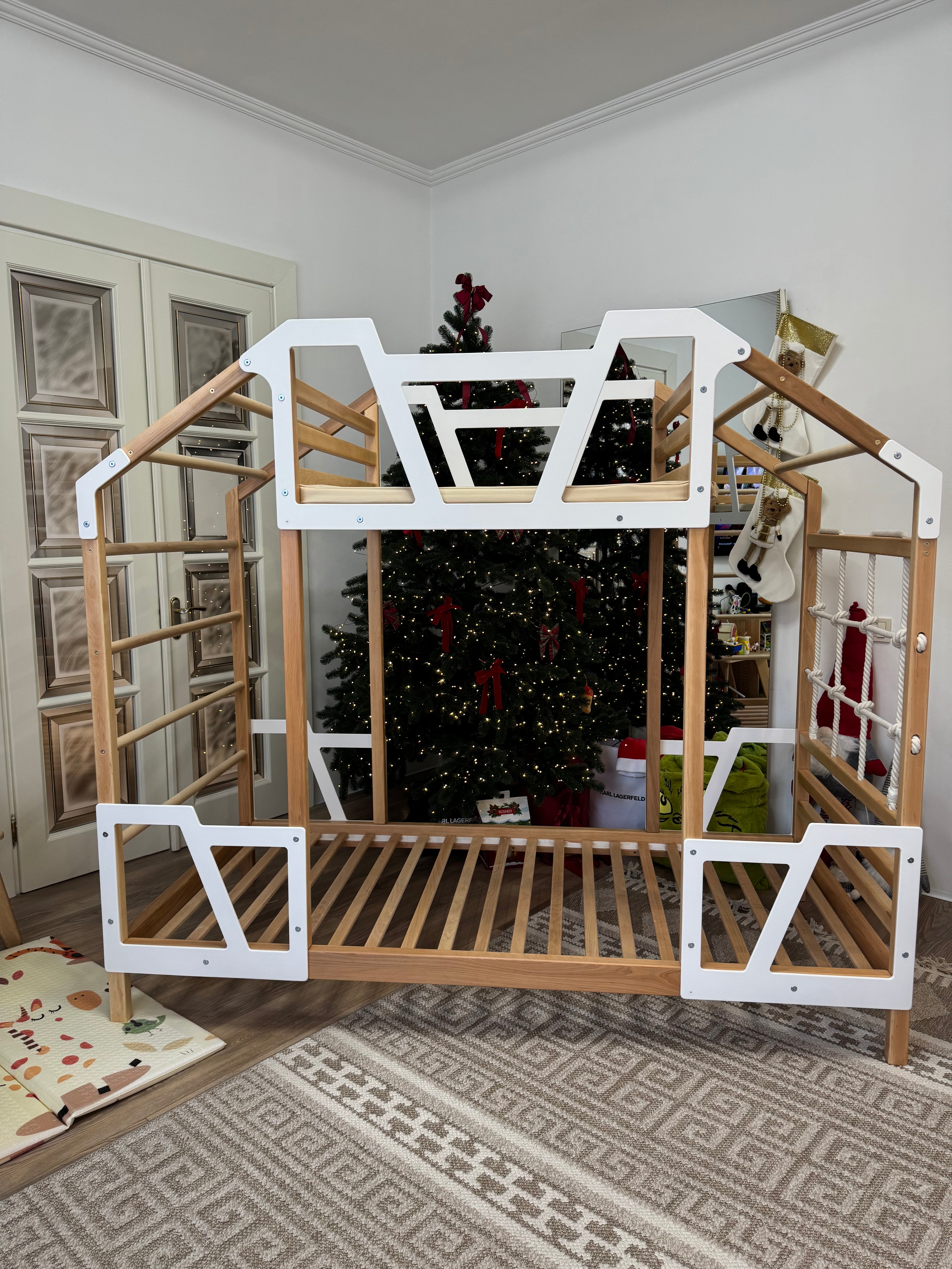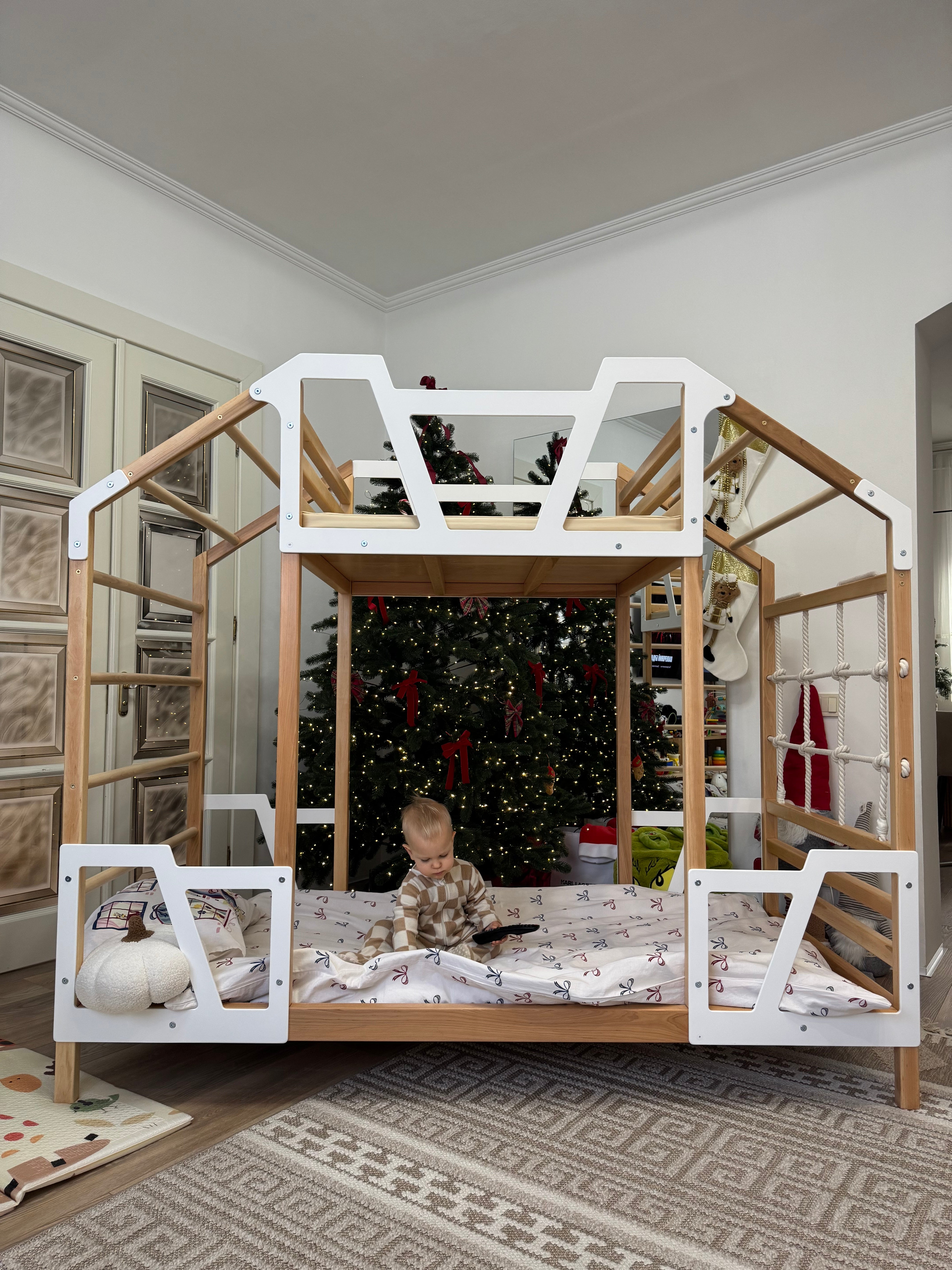 Our bunk beds are made from solid Alder wood, finished with eco-friendly, water-based coatings. Climbing elements are built from durable beech wood and cotton rope, while decorative panels are crafted from birch plywood. Every surface is sanded down to a smooth level to protect your child's tender skin, creating a comfortable and secure place for them to play and rest