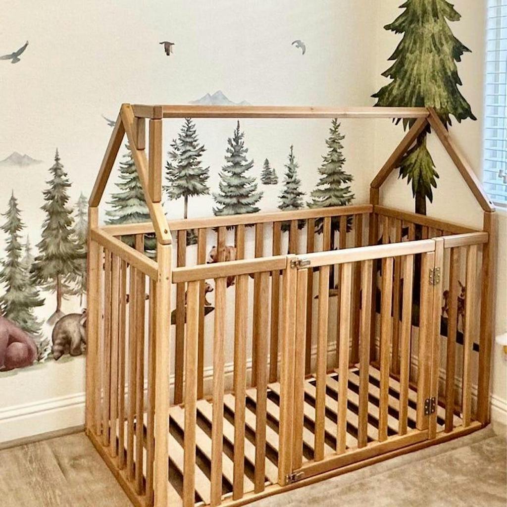 Montessori wood House Playpen Bed with Fall Protection Floor & Slats & Roof (Model 21)