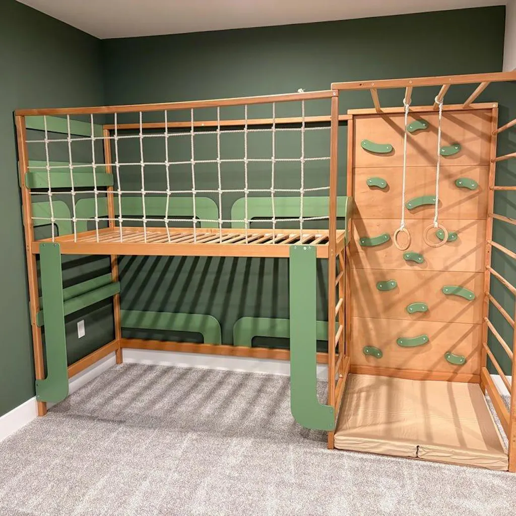 With twin over twin bunk beds, you can transform your child's bedroom into a jungle-themed adventure! It's designed as a stylish bunk bed with a built-in climbing wall, making it great for energetic children and siblings or sleepovers. Whether you're designing a toddler's room or arranging a shared space, this twin toddler bed is a fun and functional option.