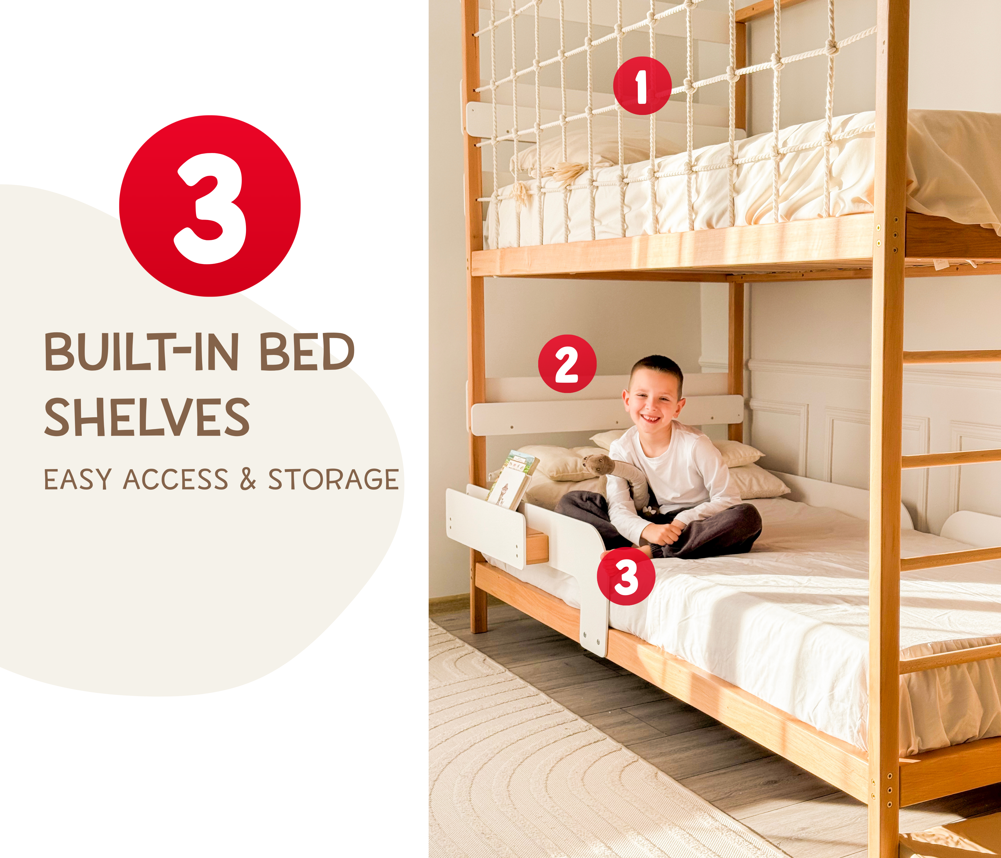The bed features a high safety net on the upper bunk, a sturdy climbing wall with easy-grip supports, and a low bottom bunk ideal for younger children. The strong ladder makes it simple to reach the top, and the net provides additional protection against falls while your child naps or plays.