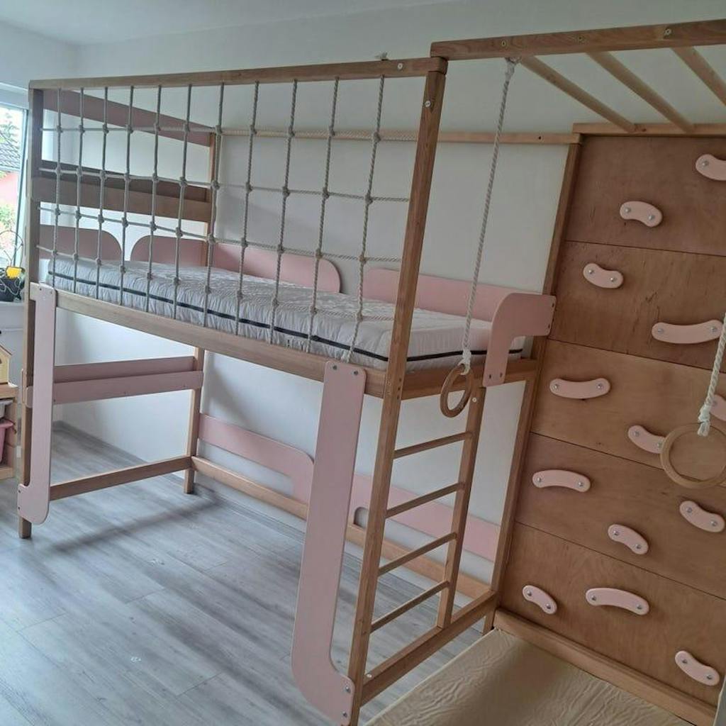 With these 2 twin beds, you can transform your child's bedroom into a jungle-themed adventure! They are designed as a stylish bunk bed with a built-in climbing wall, making it great for energetic children and siblings or sleepovers. Whether you're designing a toddler's room or arranging a shared space, this toddler bed is a fun and functional option.