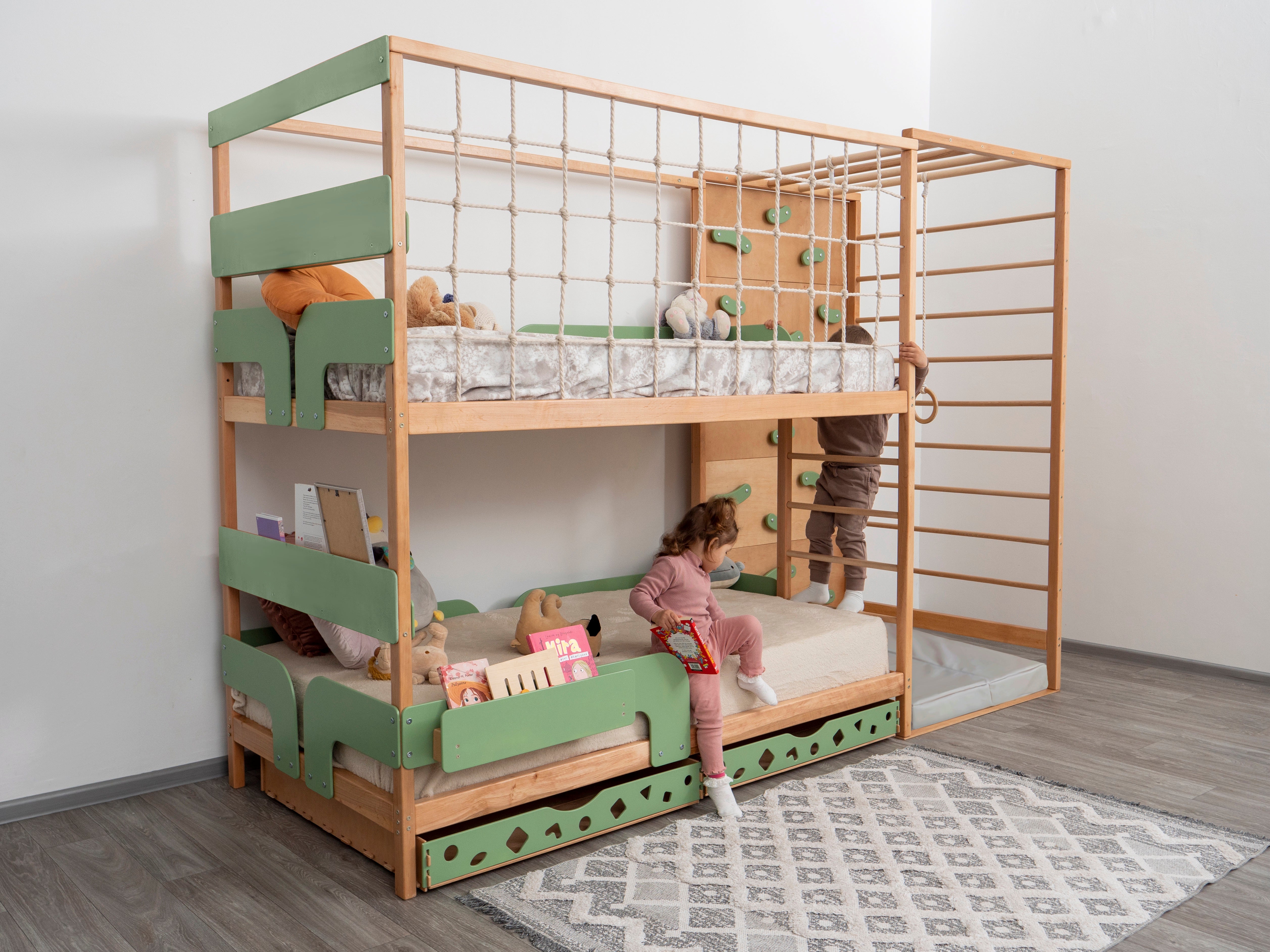 Turn your child's room into a thrilling jungle adventure with our Jungle Set! Designed with both creativity and safety in mind, this Montessori-inspired bunk bed fosters imagination while providing a secure sleeping environment. Featuring an integrated play area with engaging climbing elements and convenient storage compartments for keeping your little explorer's treasures organized, every bedtime becomes an exhilarating expedition. Additionally, you have the option to choose a version with a study desk or without, catering to your child's unique needs. Make their dreams a reality with the Jungle Set – the ultimate gift for your young adventurer!