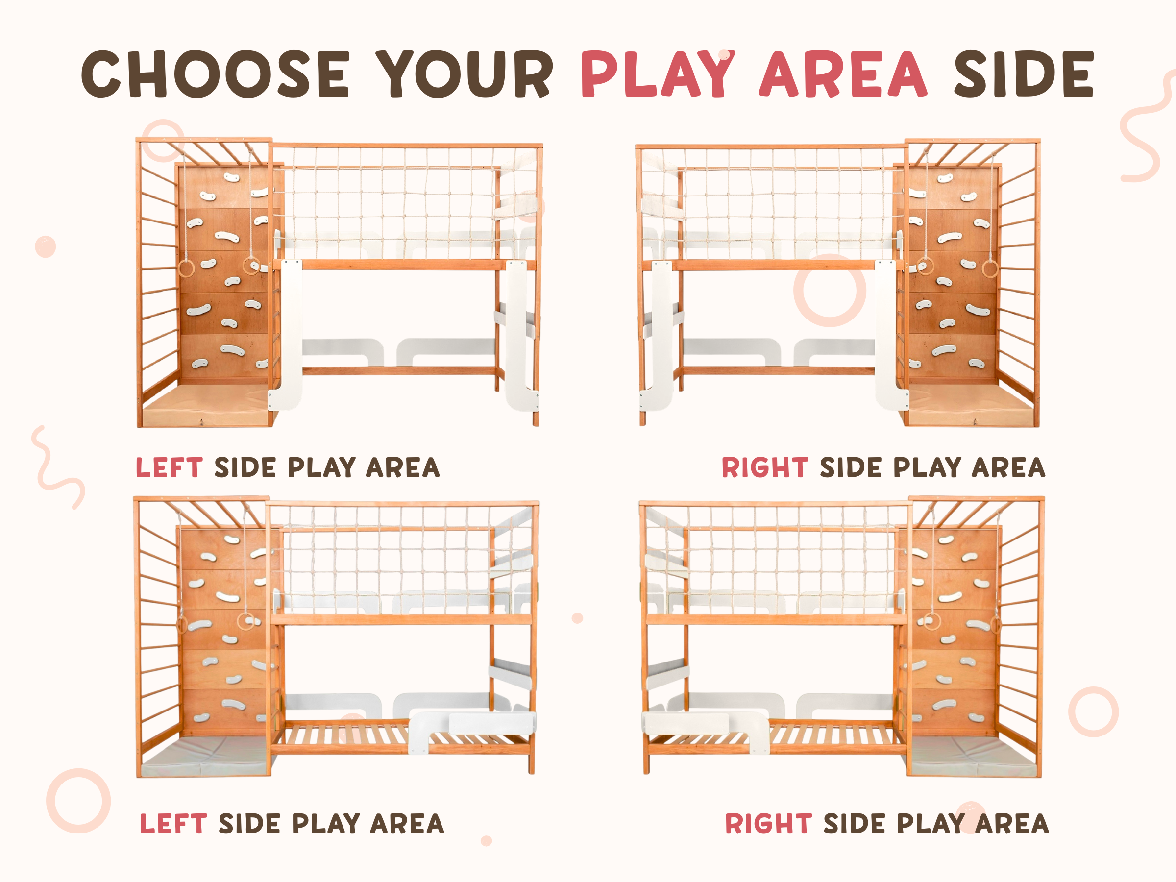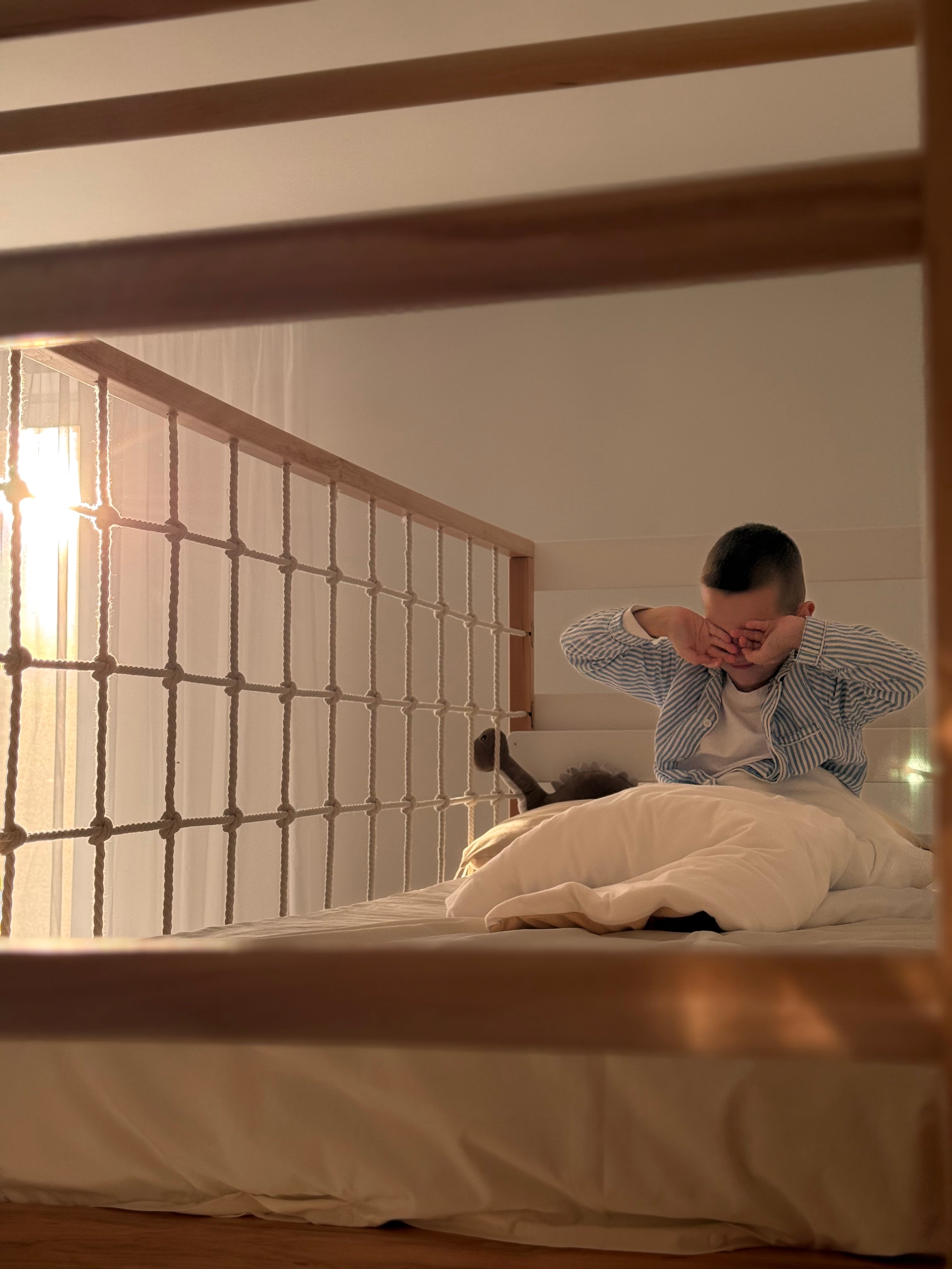 Our 2 twin beds are made from sturdy, solid Alder wood and finished with water-based coatings. The climbing elements are crafted from beech wood and cotton rope. Decorative panels are made of birch plywood. The surfaces are carefully sanded to be smooth and splinter-free, perfect for your child’s sensitive skin.