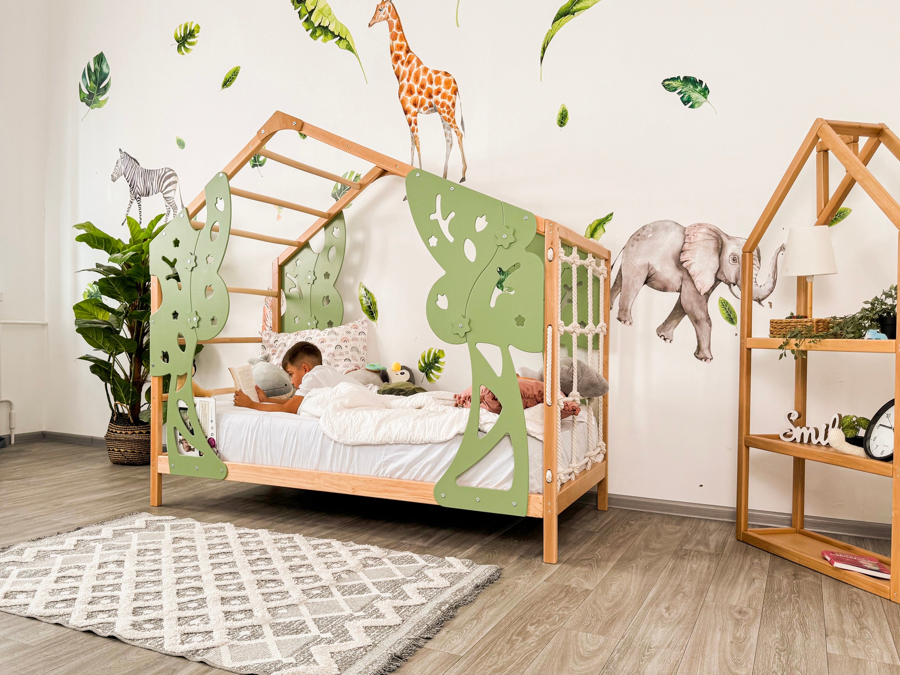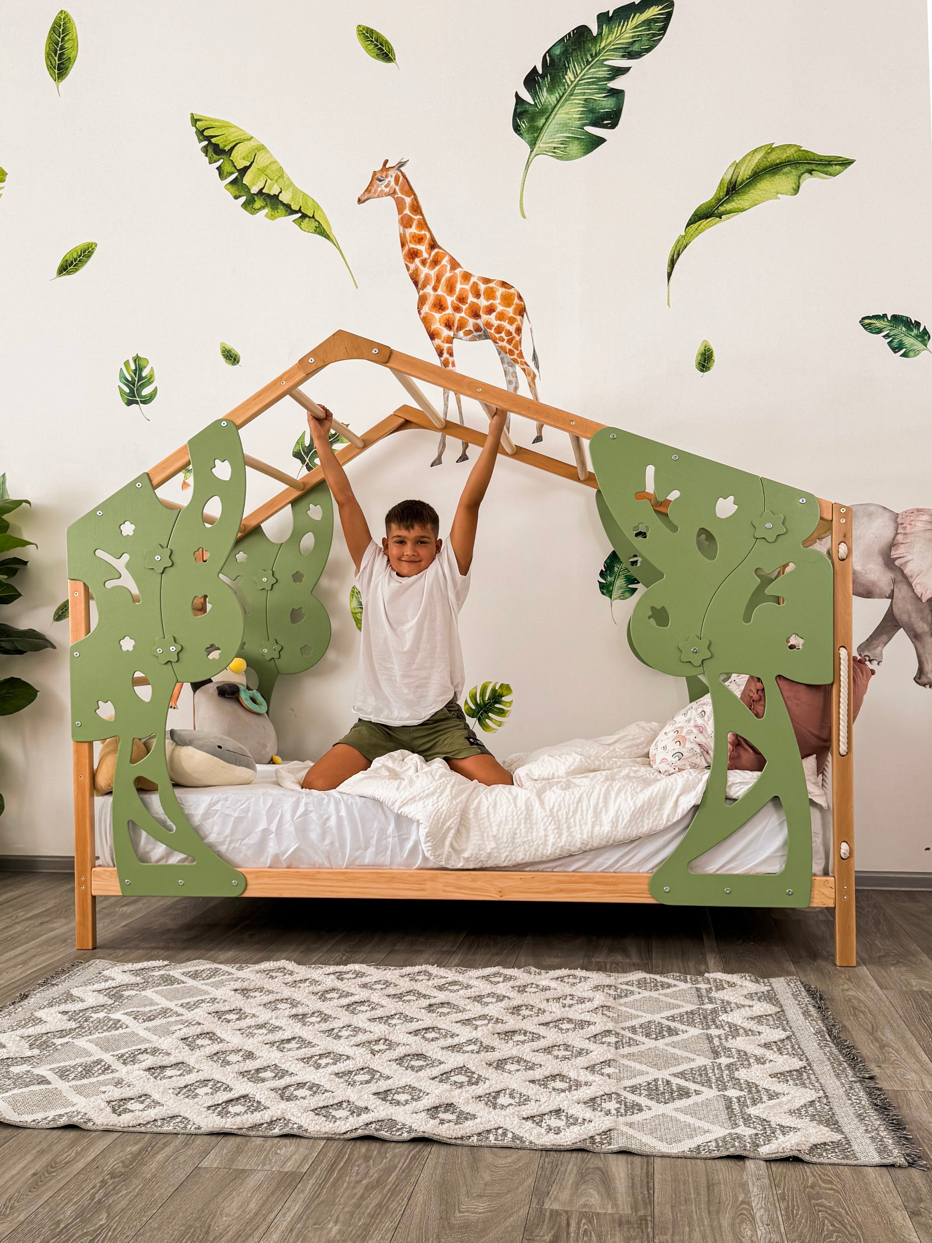 ⭐️ BusyWood Forest Bed is a unique combination of a comfortable toddler bed and a wooden play gym. This kids playground is created to give your child personal space, relaxing rest and active development at the same time. This extraordinary bed features a rope net wall and a sturdy ladder, transforming bedtime into a thrilling escapade. Designed to serve as both a cozy toddler bed for peaceful slumber and an exhilarating playhouse for endless fun and frolic, it guarantees hours of joyous activities for your kiddo.