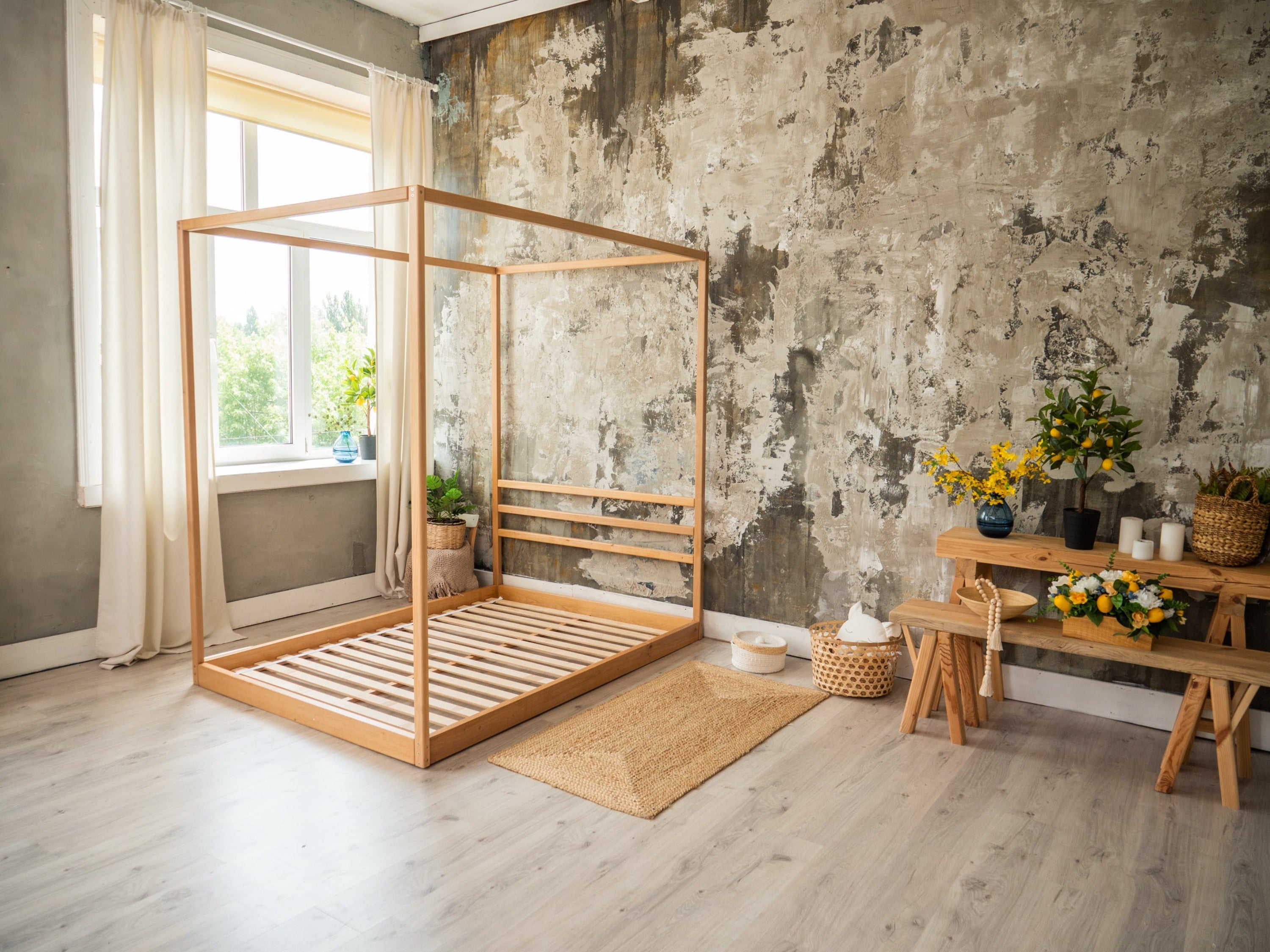 Our twin canopy bed is a luxurious and elegant piece of furniture that complements the Montessori philosophy. It is ideal for areas that are free for children to move about and safely because it is low to the ground and heavily constructed. The bed's simple elegance pairs well with any home decor, and its versatility allows it to be easily adjusted with bedding and décor.
