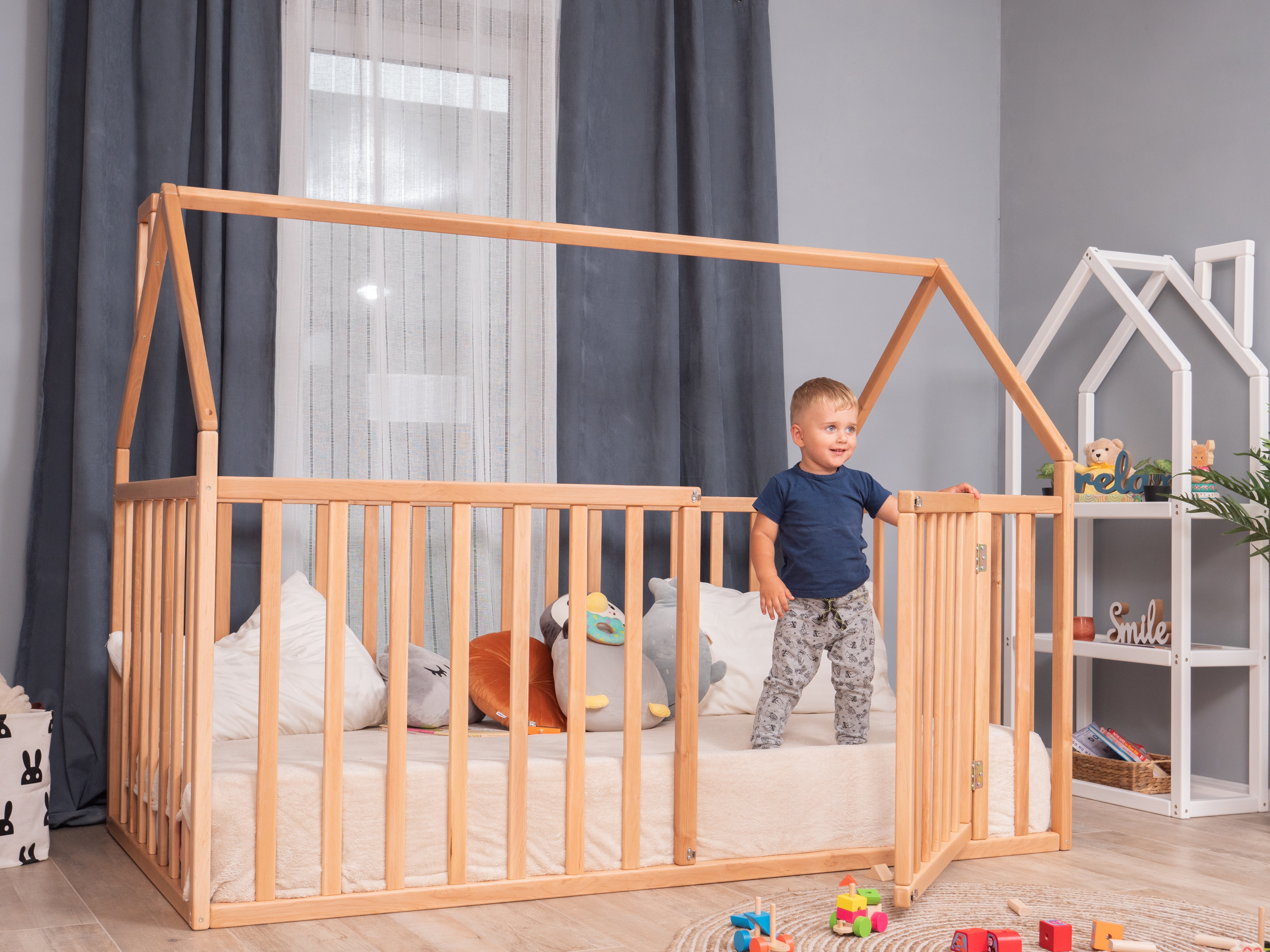 Our Baby Crib Floor Bed is carefully designed to promote independent and safe sleeping for your baby. Following the Montessori philosophy, this toddler floor bed allows your little one to move freely and build confidence from an early age. The high railings keep your child safe inside, even when they move around or play. Handcrafted from durable wood, each crib bed is polished by hand to ensure smooth, rounded edges — no sharp corners! Finished with non-toxic paints ,it's a safe and eco-conscious choice for your nursery.Whether you're creating a Montessori bedroom or simply seeking a safer, floor-level sleeping space for your baby, this floor crib bed is a beautiful, functional solution.